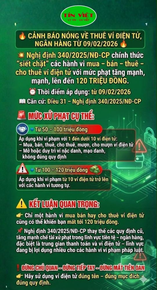 Kể từ ngày 09/02/2026, hành vi mua, bán, thuê, cho thuê ví điện tử sẽ bị xử phạt rất nặng, với mức phạt tối đa lên đến 120 triệu đồng theo Nghị định 340/2025/NĐ-CP. Quy định mới này là bước đi cần thiết nhằm xây dựng môi trường thanh toán số an toàn, minh bạch và bền vững, đồng thời góp phần phòng ngừa và ngăn chặn các hành vi vi phạm pháp luật trong lĩnh vực tài chính – ngân hàng.