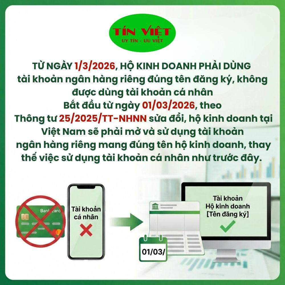 Bắt đầu từ ngày 01/03/2026, theo Thông tư 25/2025/TT-NHNN sửa đổi, hộ kinh doanh tại Việt Nam sẽ phải mở và sử dụng tài khoản ngân hàng riêng mang đúng tên hộ kinh doanh, thay thế việc sử dụng tài khoản cá nhân như trước đây.