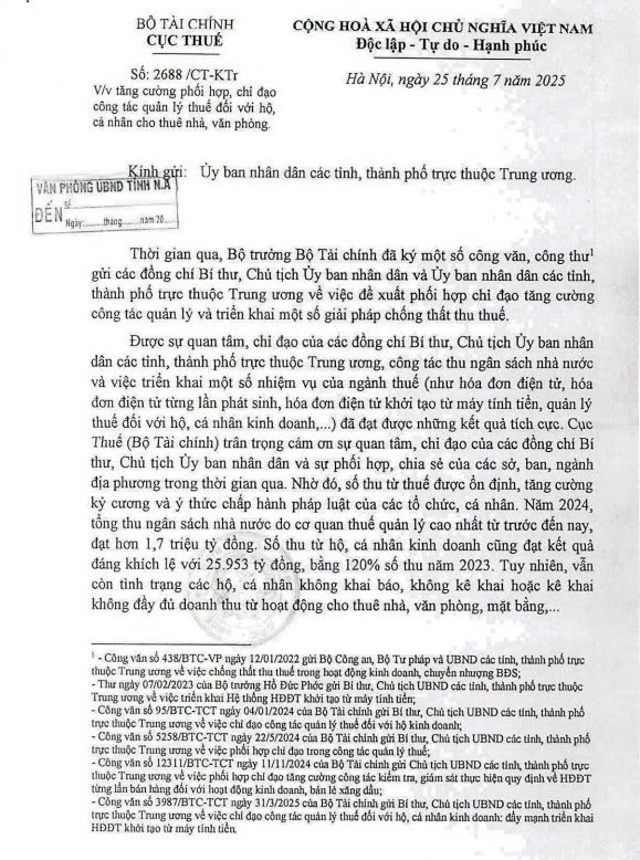 Ngày 25/7/2025, Cục Thuế đã ban hành Công văn 2688/CT-KTr về việc tăng cường quản lý thuế đối với hộ, cá nhân cho thuê nhà, văn phòng, căn hộ và mặt bằng.