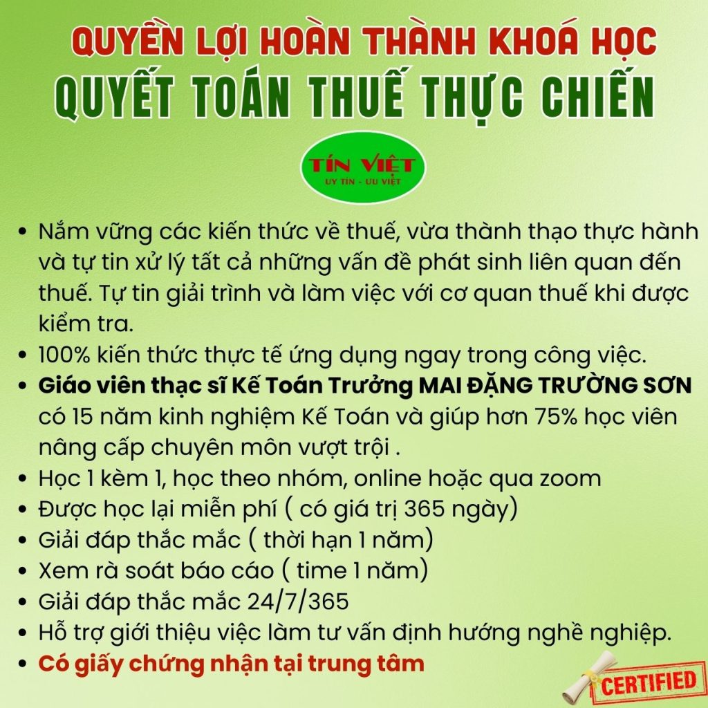 - >>>Đã có trung tâm Đào Tạo Tín Việt nơi thạc sỹ kế toán trưởng đứng lớp và kinh nghiệm quyết toán hơn 1000 doanh nghiệp sẽ giúp bạn giải quyết tất cả những nỗi lo trên. Khoá học Quyết Toán Thuế Thực Chiến tại trung tâm Đào Tạo Tín Việt giúp bạn nắm vững kiến thức, kỹ năng về kế toán, luật thuế và kinh nghiệm thực tế. Từ đó bạn hoàn toàn tự tin quyết toán thuế tháng, Quý, Năm.
