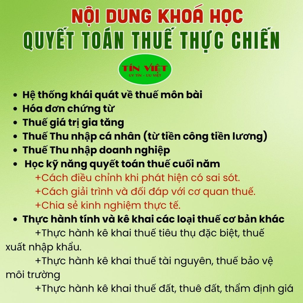 - >>>Đã có trung tâm Đào Tạo Tín Việt nơi thạc sỹ kế toán trưởng đứng lớp và kinh nghiệm quyết toán hơn 1000 doanh nghiệp sẽ giúp bạn giải quyết tất cả những nỗi lo trên. Khoá học Quyết Toán Thuế Thực Chiến tại trung tâm Đào Tạo Tín Việt giúp bạn nắm vững kiến thức, kỹ năng về kế toán, luật thuế và kinh nghiệm thực tế. Từ đó bạn hoàn toàn tự tin quyết toán thuế tháng, Quý, Năm.