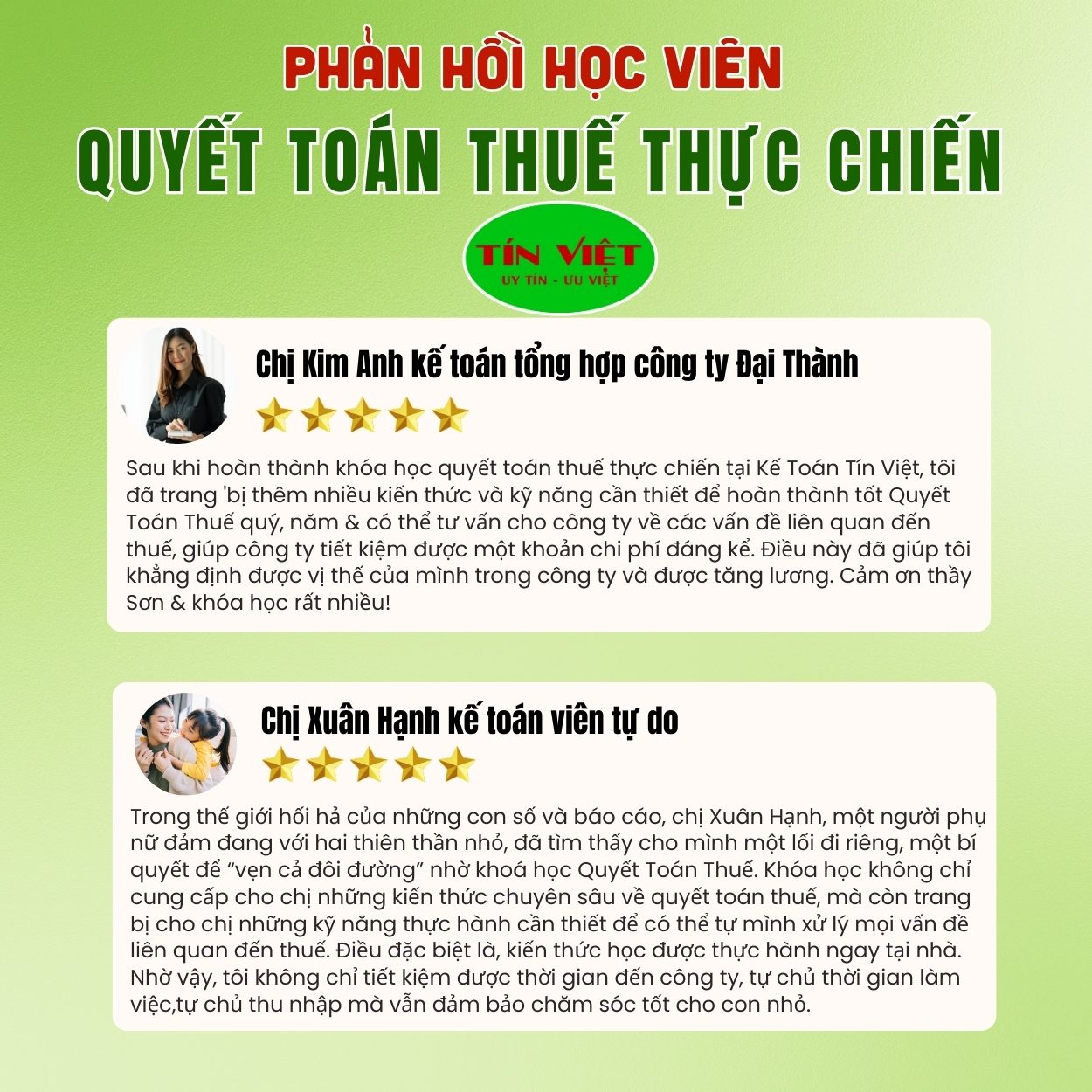 - Chị Kim Anh kế toán tổng hợp công ty Đại Thành : Sau khi hoàn thành khóa học quyết toán thuế thực chiến tại Kế Toán Tín Việt, tôi đã trang ‘bị thêm nhiều kiến thức và kỹ năng cần thiết để hoàn thành tốt Quyết Toán Thuế quý, năm & có thể tư vấn cho công ty về các vấn đề liên quan đến thuế, giúp công ty tiết kiệm được một khoản chi phí đáng kể. Điều này đã giúp tôi khẳng định được vị thế của mình trong công ty và được tăng lương. Cảm ơn thầy Sơn & khóa học rất nhiều!